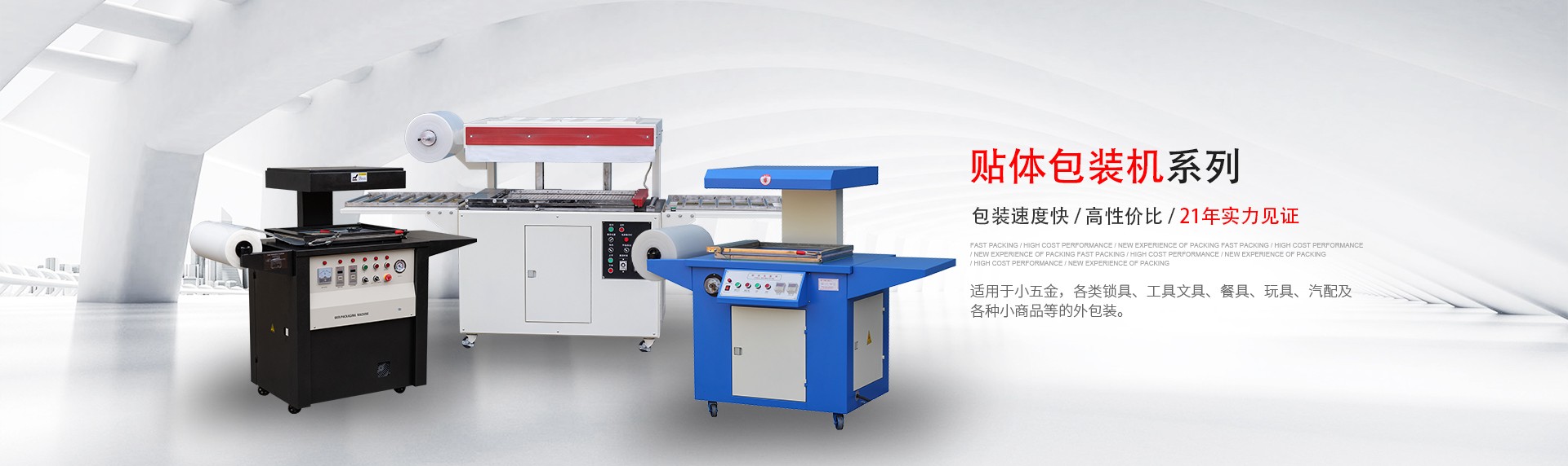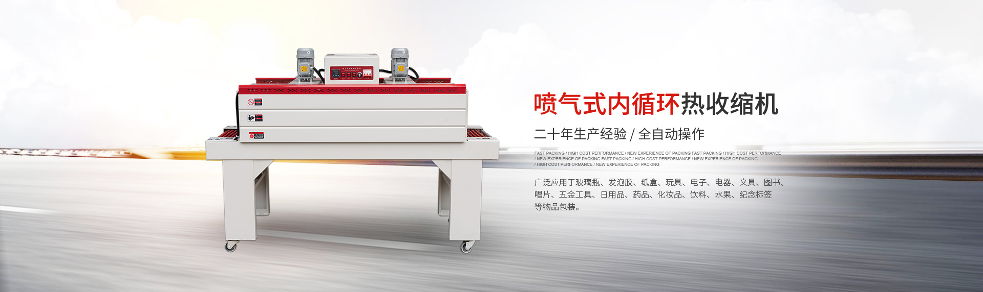 現(xiàn)主要產(chǎn)品有:全自動(dòng) L 型、邊封薄膜封切機(jī)、節(jié)能噴氣式內(nèi)循環(huán)熱收縮機(jī)、貼體包裝機(jī)、吸塑包裝機(jī)、高周波塑膠熔接機(jī)、袖口式套膜機(jī)、枕式包裝機(jī)等多個(gè)系列的包裝機(jī)械